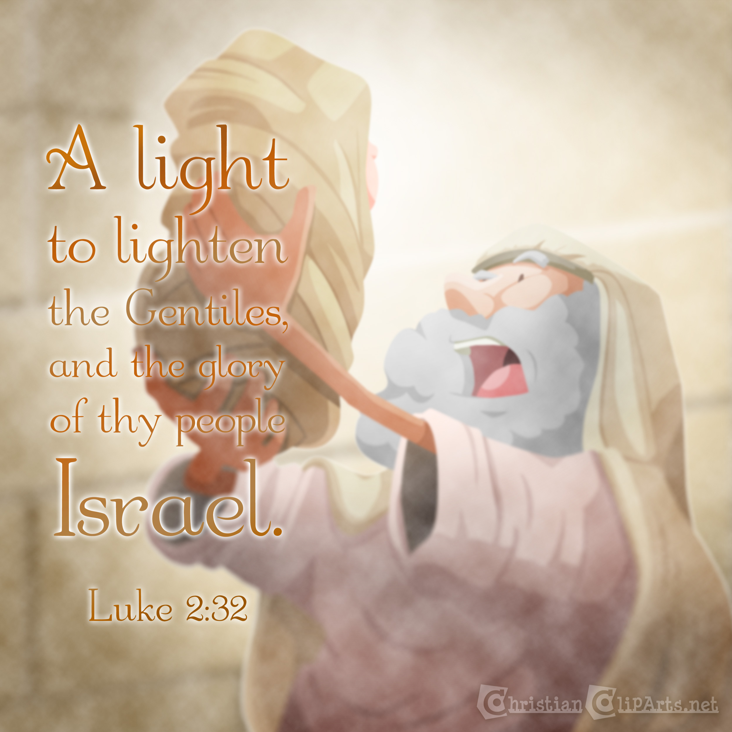 Then took he him up in his arms, and blessed God, and said,Lord, now lettest thou thy servant depart in peace, according to thy word:For mine eyes have seen thy salvation, Which thou hast prepared before the face of all people; A light to lighten the Gentiles, and the glory of thy people Israel. |